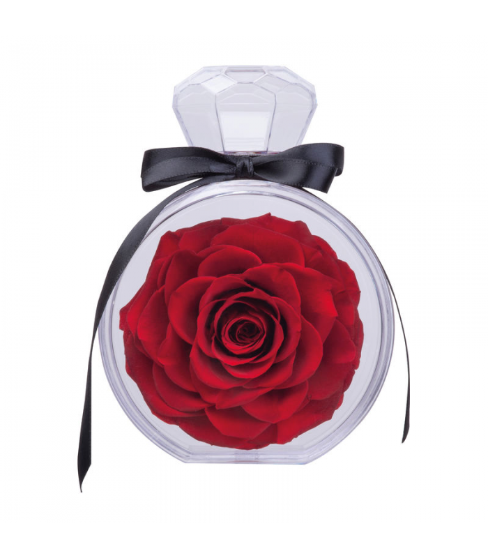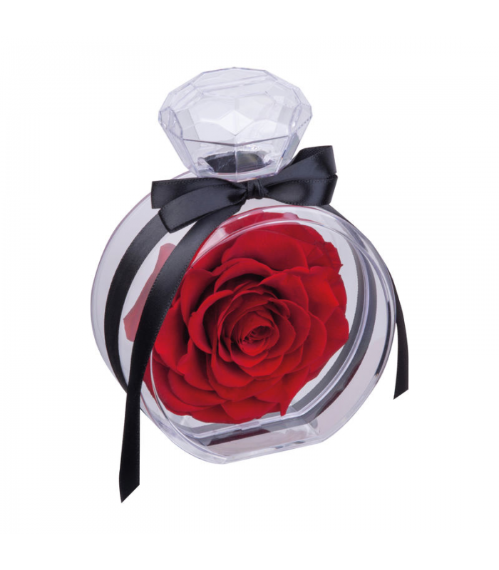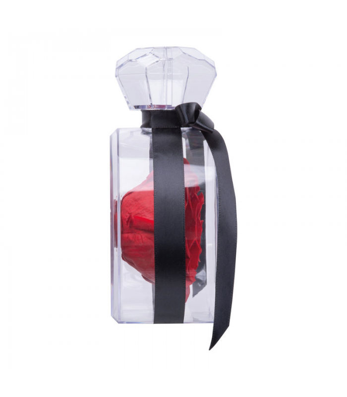 Trandafir natural conservat într-o sticluță din acril cu panglică și finisaj rafinat, cu aspect de cristal. Trandafirul își păstrează frumusețea naturală timp de mai mulți ani, fiind un cadou elegant și durabil.